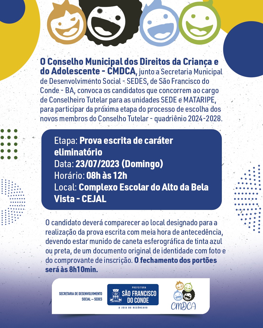 O Conselho Municipal dos Direitos da Criança e do Adolescente - CMDCA, junto a Secretaria Municipal de Desenvolvimento Social - SEDES, de São Francisco do Conde - BA, convoca os candidatos que concorrem ao cargo de Conselheiro Tutelar para as unidades SEDE e MATARIPE, para participar da próxima etapa do processo de escolha dos novos membros do Conselho Tutelar - quadriênio 2024-2028.